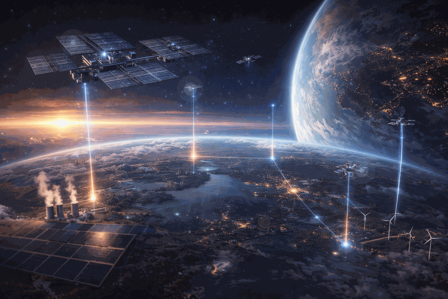 Quellenverbund Erde + Orbit Dieses Motiv zeigt den Quellenverbund als Zukunftsmodell: Solare, thermische, wasserbasierte und orbitale Energiequellen arbeiten nicht getrennt, sondern als abgestimmtes Netzwerk. Entscheidend ist nicht die einzelne Quelle, sondern ihre Verbindung im Verbund. Genau daraus entstehen Versorgungssicherheit, Skalierbarkeit und eine neue Form globaler Energiearchitektur.